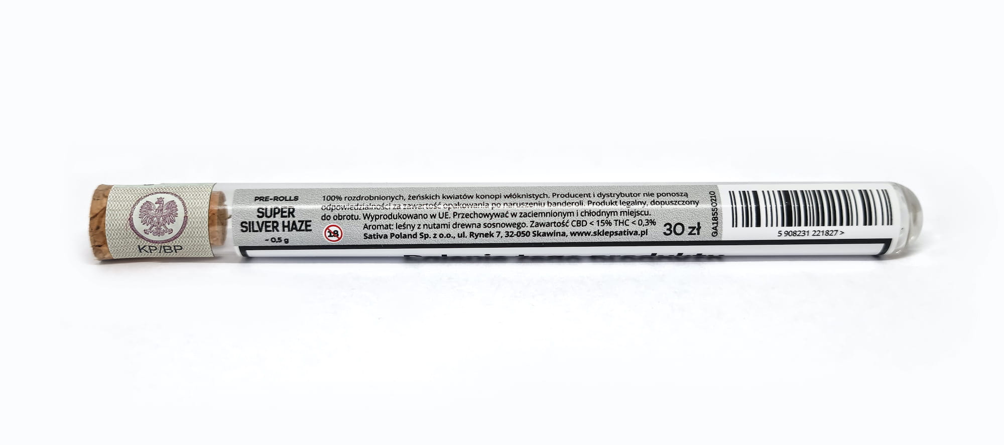 "SUPER SILVER HAZE" CBD  Pre-Rolls MAKSYMALNA CENA DETALICZNA - 30 zł 100% Legalny produkt - opłacona akcyza Stawiamy na autentyczność i sprawdzone produkty Tylko sprawdzeni dostawcy  Najlepsza Genetyka Tylko ekologiczne metody uprawy Pełna dokumentacja historii życia roślin Tylko odmiany z katalogu UE CBD Indoor Premium Buds Konopie owinięte wysokiej klasy papierem renomowanej marki RAW. 100% rozdrobnionych kwiatów żeńskich krzewów konopi włóknistych. Opakowanie zawiera ~0,5g suszu. SUPER SILVER HAZE to odmiana o niezwykle atrakcyjnym wyglądzie. Średniej wielkości topy, cechują̨ się̨ oliwkowym zabarwieniem oraz zbitą strukturą. Charakteryzuje się intensywnym aromatem leśnym z nutami drewna sosnowego. To odmiana uprawiana metodą indoor. Zawiera <15% CBD oraz THC <0,3%. Kwiaty pozyskiwane z wyselekcjonowanej, certyfikowanej odmiany, wpisanej na listę UE. Kwiaty w 100% z żeńskich roślin, gwarantowany brak nasion, starannie trymowane, najwyższa jakość. Uprawiane w kontrolowanym środowisku metodami organicznymi, bez użycia pestycydów i herbicydów. Każda seria wprowadzona przez nas do obrotu posiada przypisany Certificate of Analysis. Badamy nasze produkty w dwóch niezależnych laboratoriach. Potwierdzona certyfikatem zawartość CBD, CBDA,CBG, CBGA,CBN, CBC, D9THC, THCA, D8THC, THCV Nazwa gatunku jest nazwą marketingową. Dystrybutor i producent nie ponoszą odpowiedzialności za zawartość w przypadku naruszenia plomby. Produkt legalny, zawartość THC<0,3%, dopuszczony do obrotu. Sprawozdanie z Badań: Dokument z laboratorium w Polsce, potwierdzający legalną sumę zawartości delta-9-tetrahydrokannabinolu oraz kwasu tetrahydrokannabinolowego (kwasu delta-9-THC-2-karboksylowego). Analiza wykonywana jest na zlecenie naszej firmy, zawiera m.in. numer serii towaru tożsamy z numerem serii umieszczonym na plombie każdego opakowania detalicznego. Certificate of Analysis z Instytutu w Wiedniu. Certyfikat potwierdzający zawartości kannabinoidów, analiza wykonywana jest na zlecenie naszej firmy, zawiera m.in. numer serii towaru tożsamy z numerem serii umieszczonym na plombie każdego opakowania detalicznego.