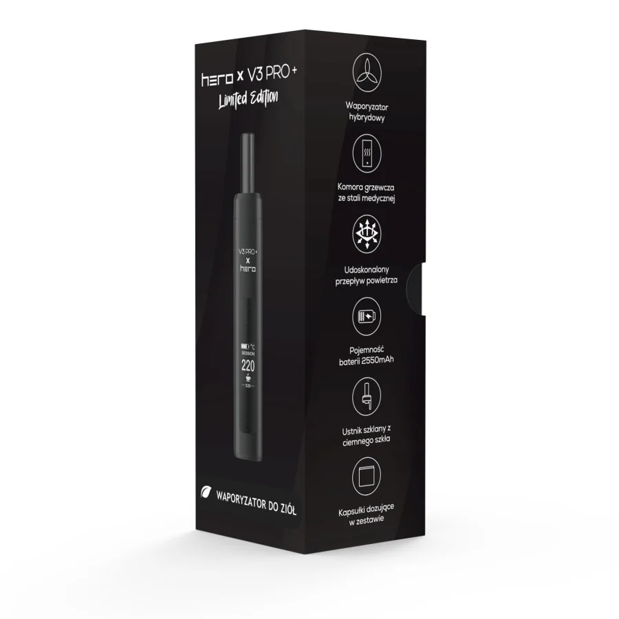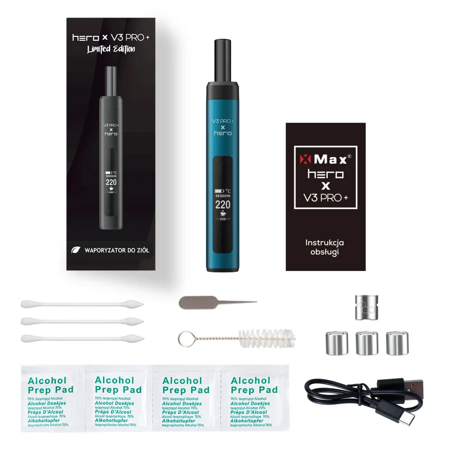 X-Max V3 PRO+ X HERO Limited Edition   X-Max V3 PRO+ X HERO Limited Edition to znacznie więcej niż zwykły waporyzator do ziół – to prawdziwa rewolucja w dziedzinie waporyzacji. Od etapu projektowania po końcowy efekt, ten model wyróżnia się na wielu płaszczyznach. Dzięki zaawansowanej technologii, innowacyjnemu designowi oraz nieustannemu dążeniu do perfekcji, X-Max V3 PRO+ X HERO Limited Edition jest powszechnie uznawany za czołowy waporyzator do ziół. Jego wyjątkowa jakość wykonania i doskonała wydajność zyskały uznanie i zaufanie użytkowników na całym świecie. Każdy element X-Max V3 PRO+ X HERO Limited Edition został starannie zaprojektowany, aby zapewnić użytkownikowi wyjątkowe doznania podczas inhalacji ziół. Od ergonomicznego kształtu po intuicyjne sterowanie, każdy detal został dopracowany, aby zapewnić maksymalną satysfakcję. Dzięki zaawansowanym funkcjom, takim jak precyzyjna kontrola temperatury, szybkie nagrzewanie, tryb ON DEMAND oraz łatwa wymiana komponentów, model ten pozwala na spersonalizowane doświadczenia waporyzacyjne dostosowane do indywidualnych potrzeb użytkownika. Niezależnie od tego, czy jesteś doświadczonym miłośnikiem waporyzacji, czy dopiero zaczynasz swoją przygodę, X-Max V3 PRO+ X HERO Limited Edition zawsze dostarcza niezawodną wydajność. Dzięki solidnej konstrukcji, wysokiej jakości materiałom i zaawansowanej technologii, ten waporyzator zapewnia nie tylko doskonałe rezultaty, ale również długotrwałą satysfakcję z użytkowania.   X-MAX V3 Pro Plus X HERO FUNKCJE Waporyzator X-Max V3 PRO+ X HERO Limited Edition wyróżnia się nie tylko eleganckim designem, ale także zaawansowanymi funkcjami, które pozwalają użytkownikowi dostosować doznania waporyzacyjne do swoich indywidualnych preferencji. Kluczową cechą tego modelu jest możliwość precyzyjnej kontroli temperatury, co umożliwia dostosowanie jej do różnych rodzajów ziół, zapewniając optymalne doznania smakowe i aromatyczne. Waporyzator X-Max V3 PRO+ X HERO Limited Edition oferuje również funkcję szybkiego nagrzewania ON DEMAND, co pozwala na błyskawiczne osiągnięcie pożądanej temperatury. To idealne rozwiązanie dla osób ceniących szybkość i wygodę, umożliwiając natychmiastowe rozpoczęcie sesji inhalacyjnej bez zbędnego oczekiwania.   X-MAX V3 Pro Plus X HERO FUNKCJE Ulepszony szklany czarny ustnik z magnesem W najnowszej wersji X-Max V3 PRO+ X HERO Limited Edition, inżynierowie skupili się na udoskonaleniu użytkowego doświadczenia poprzez wprowadzenie ulepszonego szklanego ustnika z magnesem.  Szklany ustnik, wykonany w głębokim odcieniu czerni, nie tylko nadaje waporyzatorowi X-Max V3 PRO+ X HERO Limited Edition elegancki wygląd, ale także stanowi estetyczne dopełnienie całościowego designu urządzenia. Jest to idealne połączenie stylu z funkcjonalnością. Zastosowanie magnetycznego zapięcia sprawia, że korzystanie z tego szklanego ustnika jest niezwykle proste i intuicyjne. Dzięki magnetycznemu mechanizmowi, ustnik można łatwo przymocować do urządzenia, zapewniając stabilność i pewność podczas waporyzacji.   Ulepszony przepływ powietrza w X-Max V3 PRO+ X HERO Limited Edition Dzięki zastosowaniu zaawansowanych technologii i precyzyjnej konstrukcji, X-Max V3 PRO+ X HERO Limited Edition zapewnia niezrównany, płynny przepływ powietrza. To sprawia, że każda inhalacja jest łatwa i przyjemna, bez żadnych oporów. Płynny przepływ powietrza również minimalizuje ryzyko przegrzewania się materiału w komorze grzewczej, co pozwala cieszyć się czystym smakiem i aromatem inhalowanych ziół. Ulepszony przepływ powietrza w X-Max V3 PRO+ X HERO Limited Edition przekłada się na jeszcze bardziej intensywne doznania podczas waporyzacji. Każdy wdech jest głębszy i bardziej satysfakcjonujący, a aromaty i smaki są wyraźniejsze i pełniejsze.   X-MAX V3 PRO Plus - ceramiczna ścieżka pary X-Max V3 Pro Plus x HERO wyróżnia się pełną ceramiczną ścieżką pary. Ta cecha zapewnia nieskazitelną czystość smaku podczas każdej sesji waporyzacyjnej, czyniąc go wyjątkowym w swojej klasie.   Komora grzewcza ze stali nierdzewnej medycznej klasy Bezpieczeństwo i trwałość to kluczowe cechy wysokiej jakości waporyzatora, dlatego komora grzewcza X-Max V3 PRO+ X HERO Limited Edition jest wykonana z najwyższej jakości stali nierdzewnej medycznej klasy. Ten wybór zapewnia użytkownikowi nie tylko bezpieczeństwo, ale także długotrwałą wydajność i niezawodność. Stal nierdzewna medycznej klasy spełnia najwyższe standardy bezpieczeństwa, jest odporna na korozję, co oznacza, że komora grzewcza nie degraduje się pod wpływem waporyzowanych substancji ani wysokiej temperatury. Dzięki temu użytkownik może mieć pewność, że proces waporyzacji jest bezpieczny dla zdrowia. Stal nierdzewna jest również znana ze swojej trwałości i odporności na uszkodzenia, co sprawia, że komora grzewcza jest wyjątkowo wytrzymała i odporna na zużycie. Ulepszenia w wersji X-MAX V3 Pro+ x HERO względem podstawowej wersji X-MAX V3 Pro - ulepszony, szklany ustnik w zestawie z czarnego szkła - ustnik zintegrowany z magnesem - poprawiony przepływ powietrza - w pełni ceramiczna ścieżka pary - komora grzewcza ze stali nierdzewnej medycznej klasy - 3 kapsułki dozujące w zestawie   Specyfikacja Rozmiar 2,7 x 15 x 2,4 cm Waga 140 g Rodzaj Przenośny Podgrzewanie Hybrydowe Przybliżona pojemność komory 0,2 g Zakres temperatury 100 do 220 °C Komora grzewcza Stal medyczna Bateria 2550 mAh Wymienna bateria Tak Kolor Niebieski Producent X-MAX Zawartość zestawu: Waporyzator X-Max V3 PRO Plus x HERO Szklany ustnik - czarne szkło Szczoteczka Mieszadełko Nasączone chusteczki do czyszczenia x4 Kapsułka dozująca ze stali nierdzewnej klasy medycznej x3 Sitko x2 Patyczki do czyszczenia x3 Kabel ładowania USB-C Instrukcja obsługi w języku polskim i angielskim Pojem